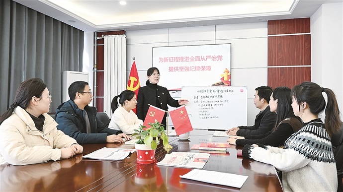 河南省洛陽市偃師區(qū)紀委監(jiān)委將學(xué)習(xí)新修訂的紀律處分條例作為今年紀律教育的“第一課”,推動紀檢監(jiān)察干部深刻認識修訂紀律處分條例的重要意義和豐富內(nèi)涵,將學(xué)習(xí)成果內(nèi)化于心、外化于行。圖為該區(qū)紀委監(jiān)委機關(guān)第五黨支部組織學(xué)習(xí)新修訂的紀律處分條例。 牛光衛(wèi) 攝
