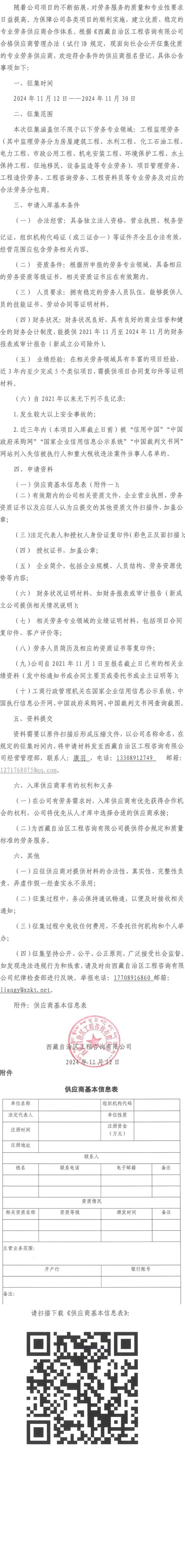 西藏自治區(qū)工程咨詢有限公司專業(yè)勞務(wù)供應(yīng)商入庫(kù)征集公告