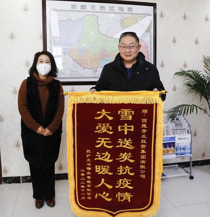 1月10日,拉薩天湖物業(yè)管理有限公司總經(jīng)理賈玉玲將一面印有“雪中送炭抗疫情,大愛(ài)無(wú)邊暖人心”的錦旗送到集團(tuán)公司,感謝西藏開(kāi)投集團(tuán)慷慨捐贈(zèng)抗疫物資,幫助解決天湖物業(yè)疫情防控實(shí)際困難和迫切需要,展現(xiàn)了國(guó)有企業(yè)的責(zé)任和擔(dān)當(dāng)。