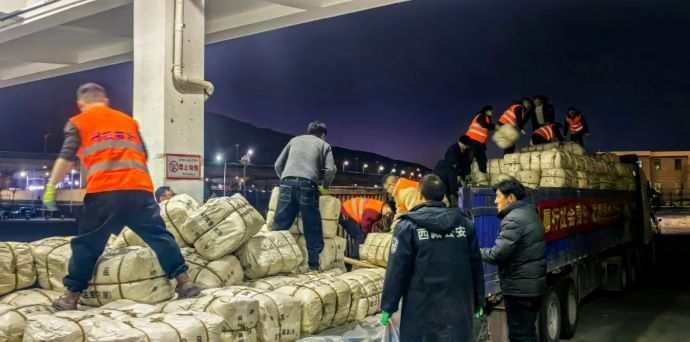 1月9日20點(diǎn),拉薩貢嘎國際機(jī)場貨站內(nèi)燈火通明,西藏開投集團(tuán)20多名工作人員正在緊急卸裝救援物資,一件件棉衣棉被下了飛機(jī)立即裝車,準(zhǔn)備運(yùn)往災(zāi)區(qū)。