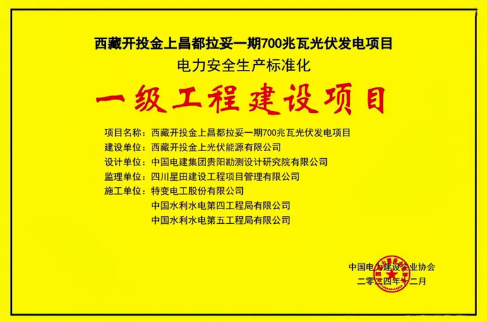 西藏開投金上拉妥一期700MW光伏發(fā)電項目于2021年12月13日取得備案批復文件,2024年12月底主體工程建設完成,具備并網(wǎng)發(fā)電條件,并于當年12月順利通過電力建設工程安全生產(chǎn)標準化一級評審,榮獲中國電力建設企業(yè)協(xié)會頒發(fā)的“電力安全生產(chǎn)標準化一級工程建設項目”榮譽。