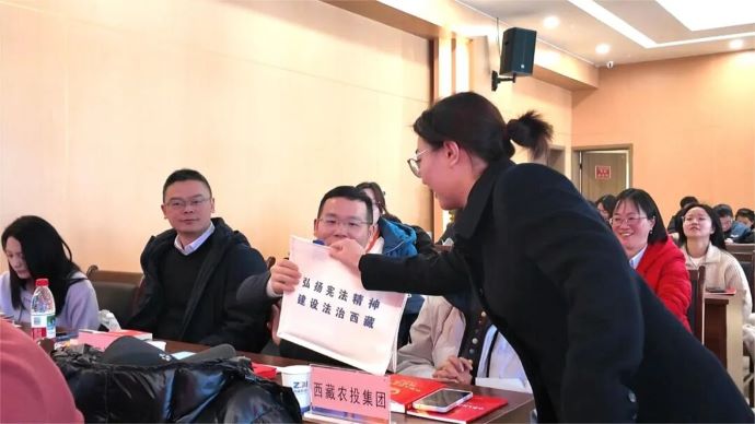 活動現(xiàn)場,一系列內(nèi)容豐富、形式新穎的環(huán)節(jié)有序開展。參會人員集中觀看了憲法精神主題影片及“憲法進(jìn)企業(yè)”主題紀(jì)錄片,直觀感受憲法的崇高權(quán)威與實(shí)踐力量;活動特邀西藏歐珠律師事務(wù)所律師歐珠永青作《憲法》專題講座,深入淺出解讀憲法核心要義與依法治企實(shí)踐路徑,充分闡釋了新時代《憲法》的新發(fā)展,引發(fā)廣泛共鳴;憲法趣味有獎問答互動環(huán)節(jié)氛圍熱烈,有效調(diào)動了干部職工學(xué)法用法的積極性;活動還設(shè)置了現(xiàn)場法律咨詢環(huán)節(jié),幫助干部職工解決工作生活中遇到的法律問題,號召大家爭做“學(xué)法先鋒、守法模范、用法表率”。