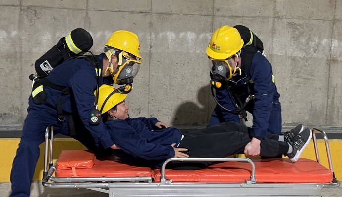 (佩戴正壓式呼吸器50米內(nèi)擔(dān)架救人競賽 許明月攝)