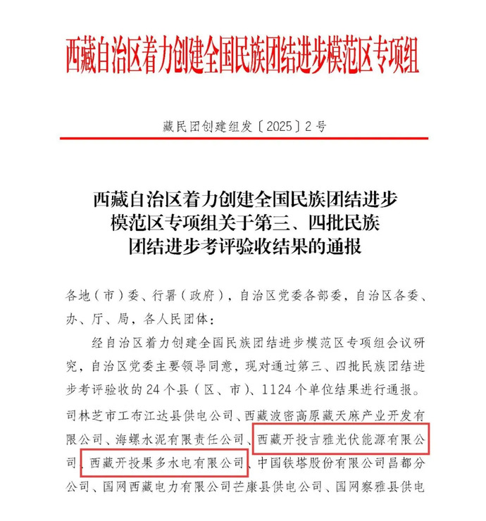 近日,西藏自治區(qū)著力創(chuàng)建全國民族團結(jié)進步模范區(qū)專項組印發(fā)《西藏自治區(qū)著力創(chuàng)建全國民族團結(jié)進步模范區(qū)專項組關于第三、四批民族團結(jié)進步考評驗收結(jié)果的通報》,西藏開投吉雅光伏公司、果多水電公司位列第四批考評驗收單位名單。