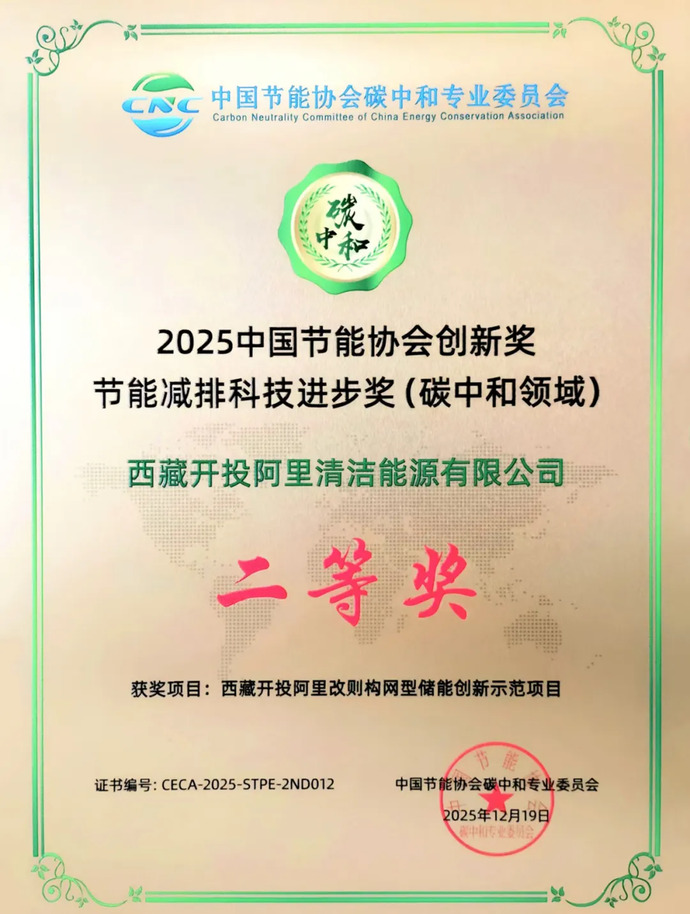 近日,由中國質(zhì)量認(rèn)證中心、中國節(jié)能協(xié)會(huì)碳中和專業(yè)委員會(huì)聯(lián)合頒發(fā)的2025中國節(jié)能協(xié)會(huì)創(chuàng)新獎(jiǎng)名單揭曉,由西藏開投阿里清潔能源公司投資建設(shè)的阿里改則構(gòu)網(wǎng)型儲(chǔ)能創(chuàng)新示范項(xiàng)目獲“節(jié)能減排科技進(jìn)步獎(jiǎng)(碳中和領(lǐng)域)二等獎(jiǎng)”。