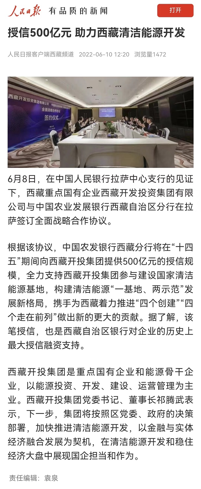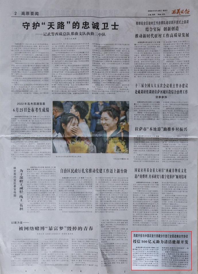 ?。ň幷甙矗?月10日,《人民日?qǐng)?bào)》客戶端西藏頻道報(bào)道了《授信500億元 助力西藏清潔能源開發(fā)》?!段鞑厝?qǐng)?bào)》2022年6月10日在第2版“高原要聞”欄目刊登文章,報(bào)道《授信500億元|西藏開投集團(tuán)與中國(guó)農(nóng)發(fā)行西藏分行簽訂全面戰(zhàn)略合作協(xié)議》。西藏電視臺(tái)2022年6月10日在西藏電視臺(tái)影視文化頻道《今晚九點(diǎn)》欄目報(bào)道了《授信500億元|西藏開投集團(tuán)與中國(guó)農(nóng)發(fā)行西藏分行簽訂全面戰(zhàn)略合作協(xié)議》,《珠峰云》平臺(tái)同步播放。新華網(wǎng)、經(jīng)濟(jì)日?qǐng)?bào)、西藏衛(wèi)視、西藏日?qǐng)?bào)客戶端、網(wǎng)信西藏、今日頭條等媒體均報(bào)道了相關(guān)新聞。全文如下: