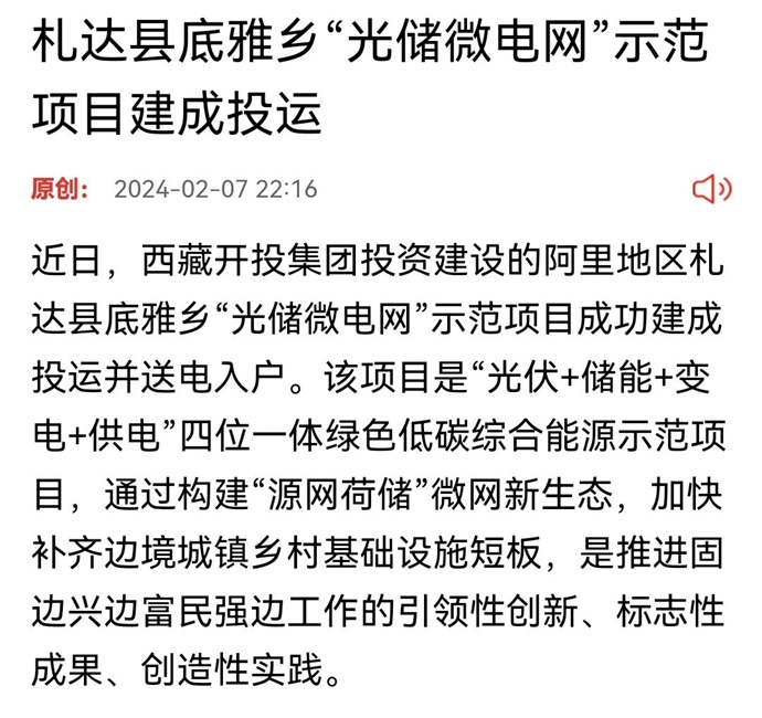 媒體報道丨西藏日報《札達(dá)縣底雅鄉(xiāng)“光儲微電網(wǎng)”示范項(xiàng)目建成投運(yùn)》