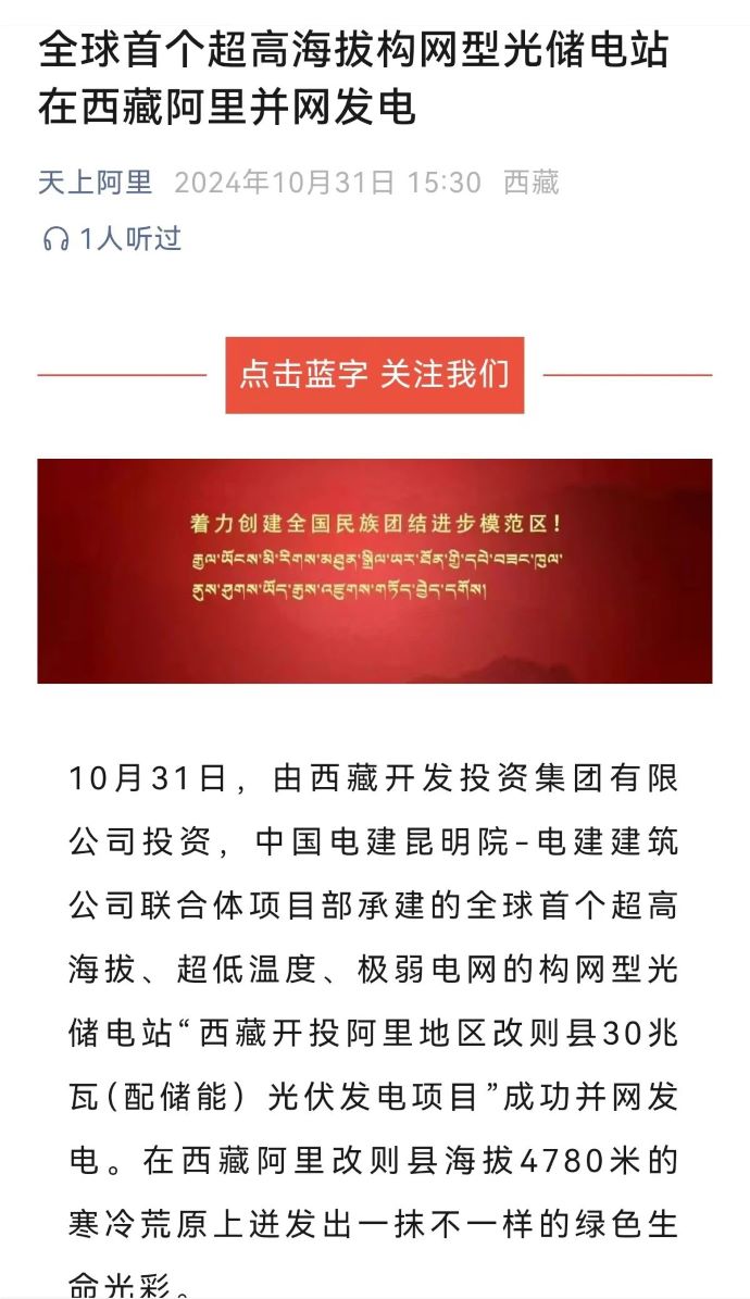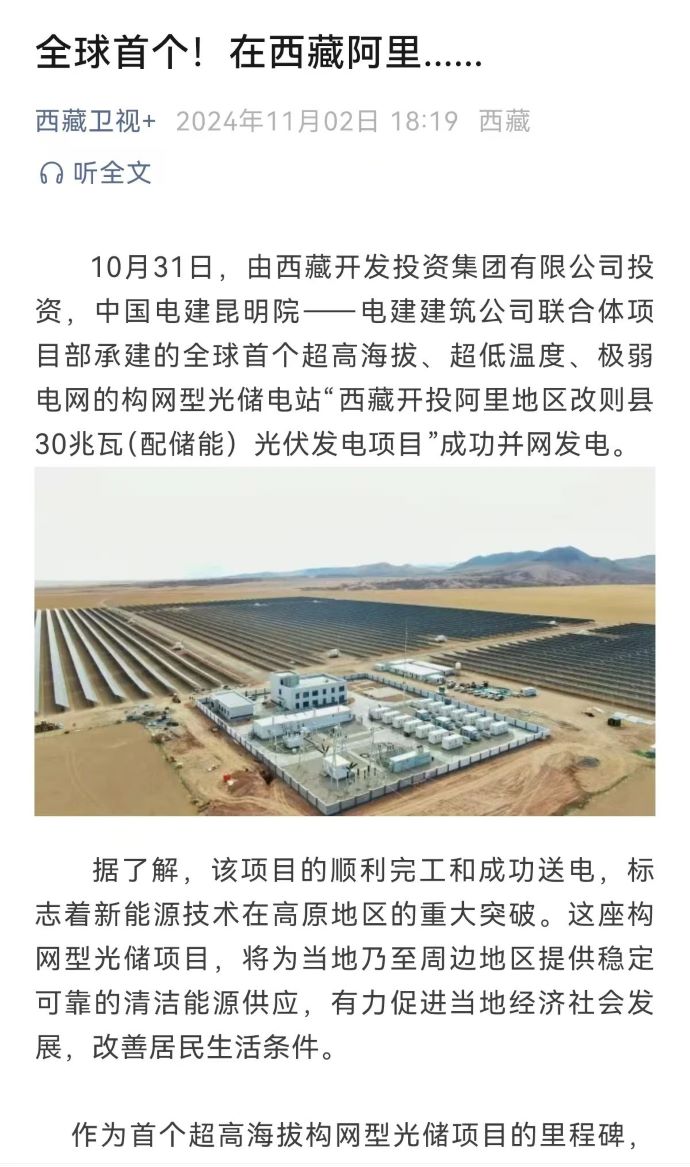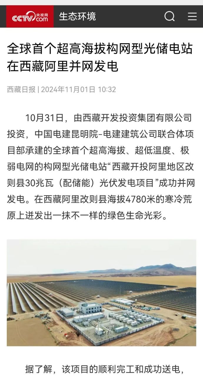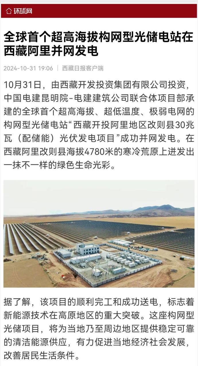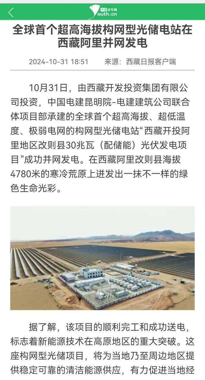 10月31日,由西藏開投集團(tuán)投資、中國電建昆明院-電建建筑公司聯(lián)合體項(xiàng)目部承建的,全球首個超高海拔、超低溫度、極弱電網(wǎng)智能組串式構(gòu)網(wǎng)型光儲電站——西藏開投阿里地區(qū)改則縣30兆瓦(配儲能)光伏發(fā)電項(xiàng)目,成功并網(wǎng)發(fā)電,標(biāo)志著新能源技術(shù)在高原地區(qū)的重大突破。