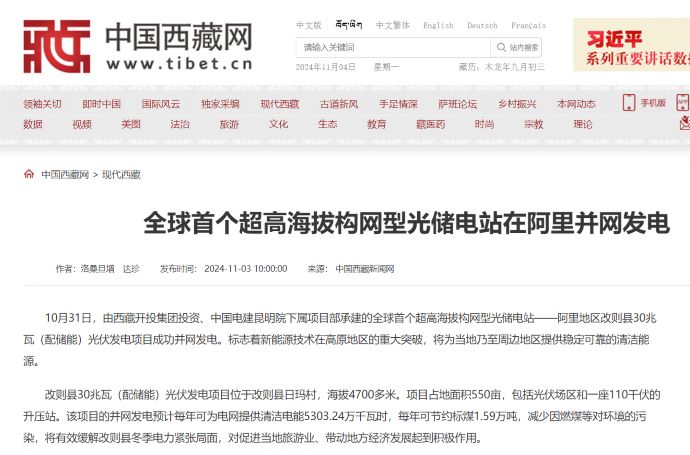 媒體報(bào)道丨全球首個超高海拔構(gòu)網(wǎng)型光儲電站在西藏阿里并網(wǎng)發(fā)電