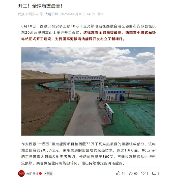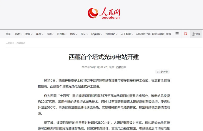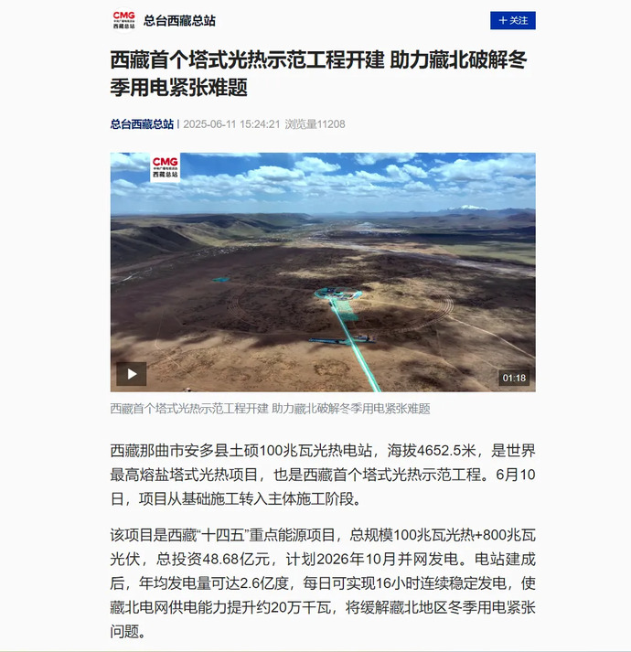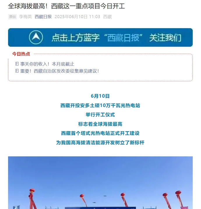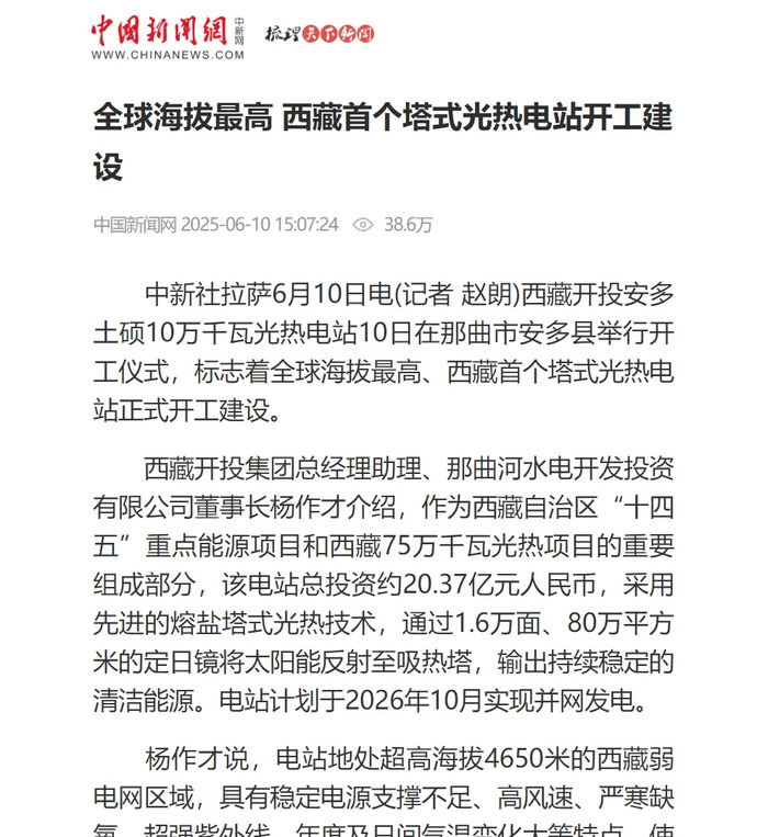 媒體報(bào)道丨全球海拔最高、西藏首個(gè)塔式光熱電站開(kāi)工建設(shè)
