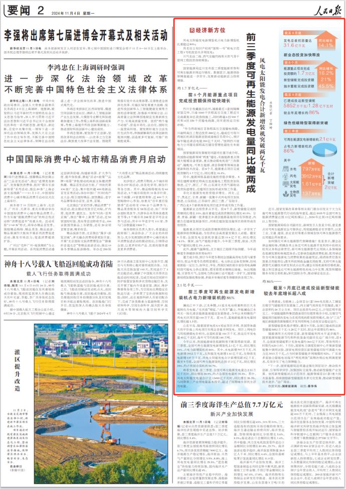 今年以來,我國能源綠色低碳轉(zhuǎn)型不斷取得新突破。前三季度,全國可再生能源發(fā)電新增裝機2.1億千瓦,同比增長21%,占電力新增裝機的86%。其中,水電新增797萬千瓦,風(fēng)電新增3912萬千瓦,太陽能發(fā)電新增1.61億千瓦,生物質(zhì)發(fā)電新增137萬千瓦,風(fēng)電太陽能發(fā)電合計新增突破2億千瓦。截至9月底,全國可再生能源裝機達到17.3億千瓦,同比增長25%,約占我國總裝機的54.7%。