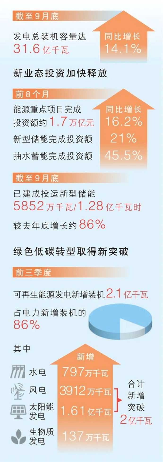 能源新業(yè)態(tài)投資多點開花。前8個月,新型儲能完成投資額同比增長21%,抽水蓄能完成投資額同比增長45.5%。甘肅、青海、新疆一批多能互補清潔能源基地項目有序推進,內(nèi)蒙古在建綠氫制備項目、河南在建加氫設(shè)施項目持續(xù)形成有效投資。