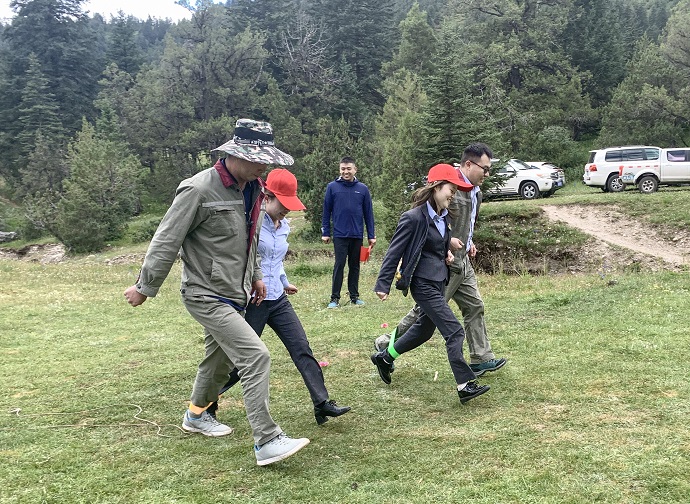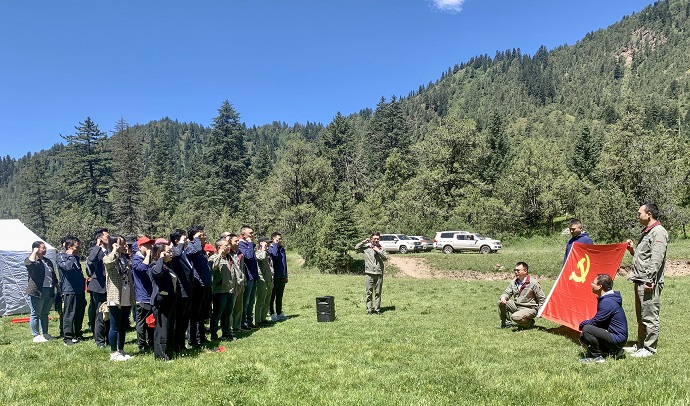 座談結(jié)束后,全體黨員面向黨旗莊嚴(yán)宣誓,重溫入黨誓詞,激勵永葆入黨初心。最后,兩支部開展了以“重溫紅色”為主題的戶外團(tuán)建活動,通過重走長征路、黨建知識問答、紅色詞匯你比我猜、兩人三足等活動進(jìn)一步增進(jìn)支部交流互動?;顒蝇F(xiàn)場,參賽隊員充分發(fā)揚團(tuán)隊精神,積極參與,精誠合作,加油聲、吶喊聲、歡呼聲此起彼伏。
