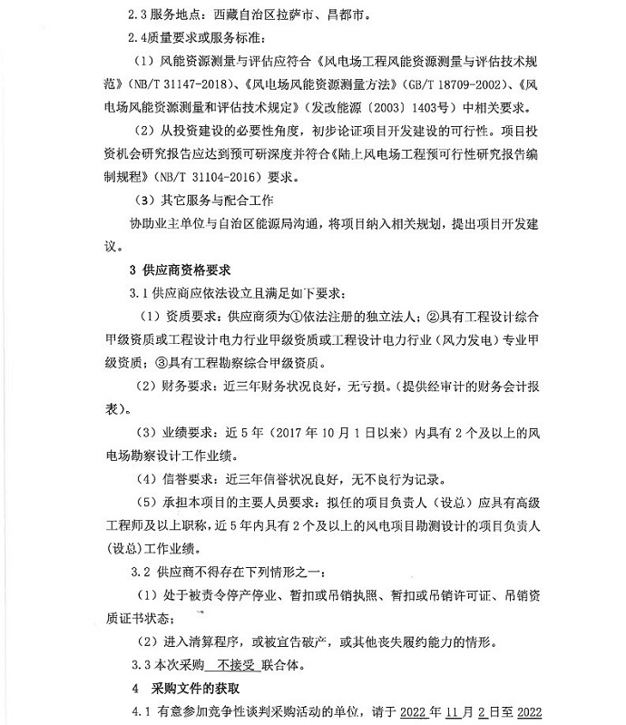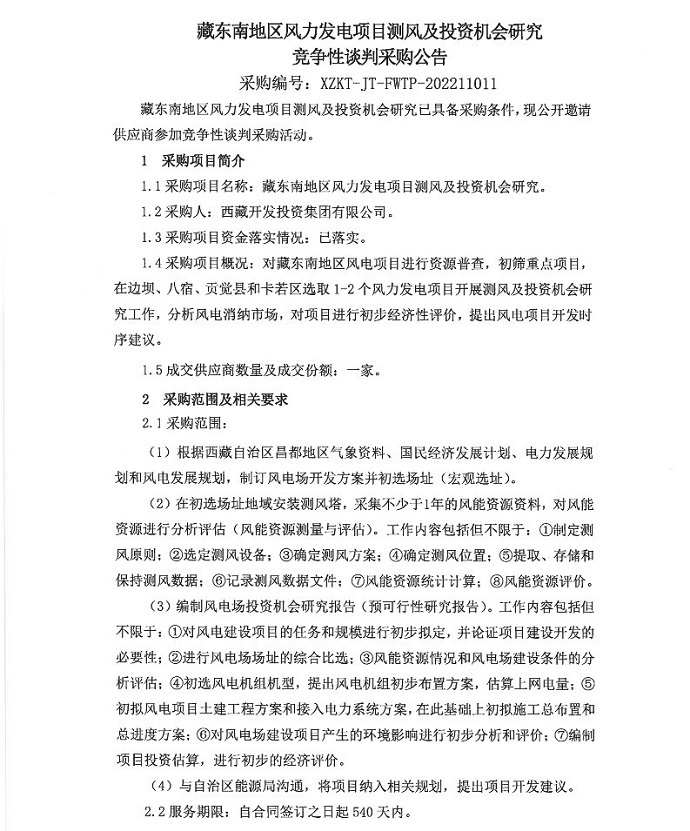 藏東南風(fēng)力發(fā)電項(xiàng)目測(cè)風(fēng)和投資機(jī)會(huì)研究競(jìng)爭(zhēng)性談判采購(gòu)公告