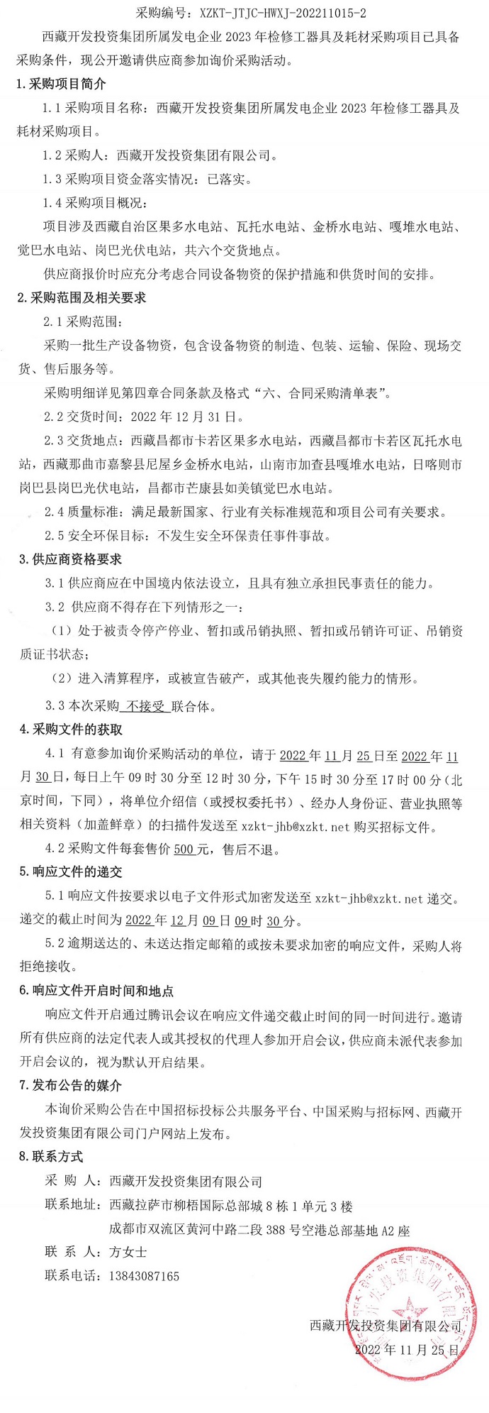 西藏開(kāi)發(fā)投資集團(tuán)所屬發(fā)電企業(yè)2023年檢修工器具及耗材