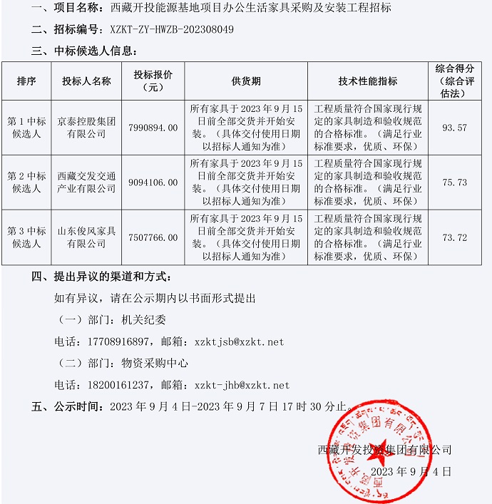 家具中標(biāo)候選人公示