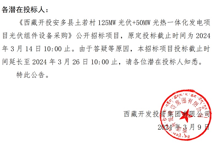 一體化發(fā)電項(xiàng)目光伏組件設(shè)備采購》投標(biāo)截止時(shí)間的公告