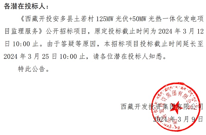光熱一體化發(fā)電項目監(jiān)理服務(wù)》投標(biāo)截止時間的公告
