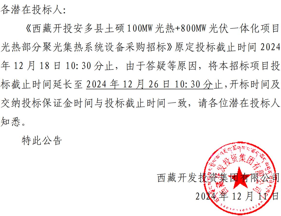 關(guān)于延長(zhǎng)《西藏開投安多縣土碩100MW光熱+800MW光伏一體化項(xiàng)目光熱部分聚光集熱系統(tǒng)設(shè)備采購招標(biāo)》投標(biāo)截止時(shí)間的公告